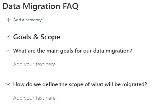 Spoiler though: if you don’t, you can still create a quite nice FAQ with foldable sections in cahoots with the trusty text webpart. It ain’t perfect, you don’t have to love it, but to be honest…for now that won’t look too much different from what we’re about to dive into.
