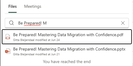 Smashing this “Get started” button in the middle rewards us with a field that pops up, allowing you to search in your FIles or Meetings for…something to create a FAQ with I suppose. With Files it suggets a couple of your most recent files, or you can search for them by typing in (part of) the name. At the end, it will let you know if there aren’t anymore files found with the same search criteria you’d entered.